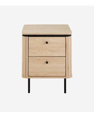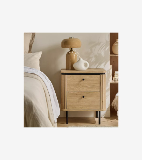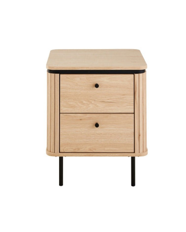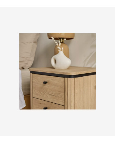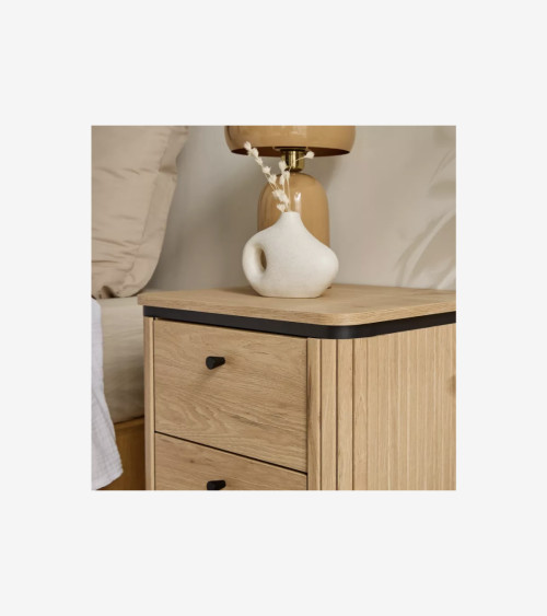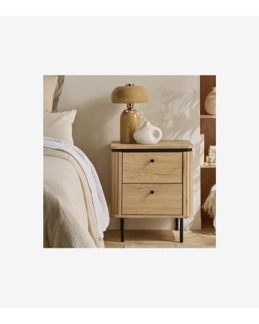 Cette table de chevet est un meuble pratique et esthétique pour votre chambre. Elle est dotée de deux tiroirs spacieux, parfaits pour ranger vos objets personnels. Le design se distingue par ses côtés recouverts de lames verticales, ajoutant une touche d'élégance vintage.