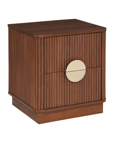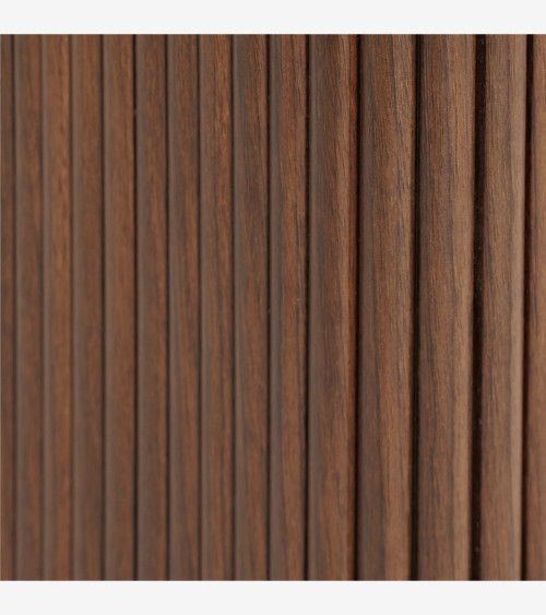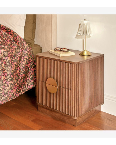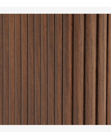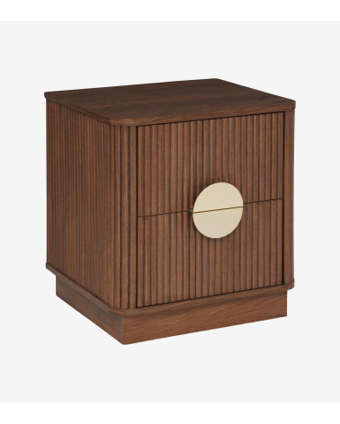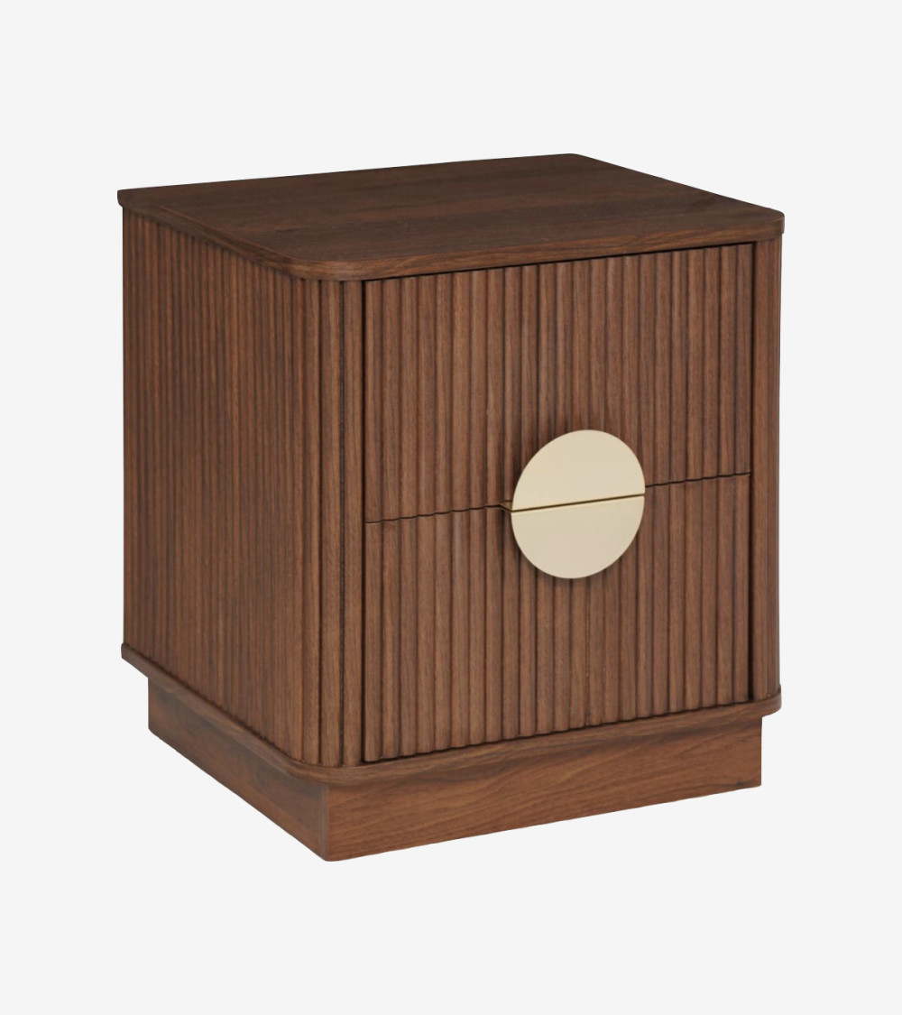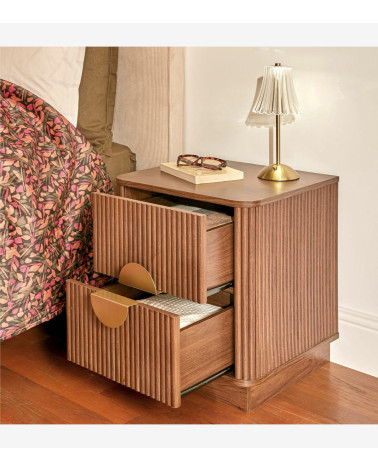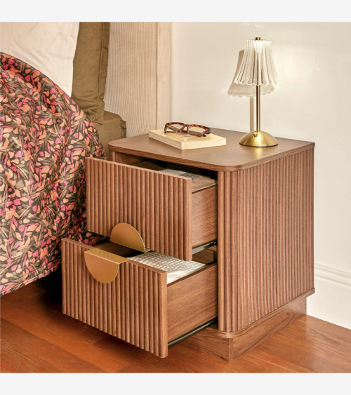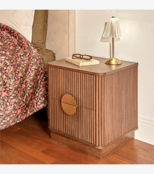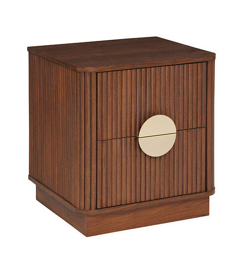 Avec sa couleur profonde, ce meuble est en bois certifié FSC® avec des poignées rondes en acier brillant. L'effet cannelé des façades prodigue un charme sophistiqué au chevet.