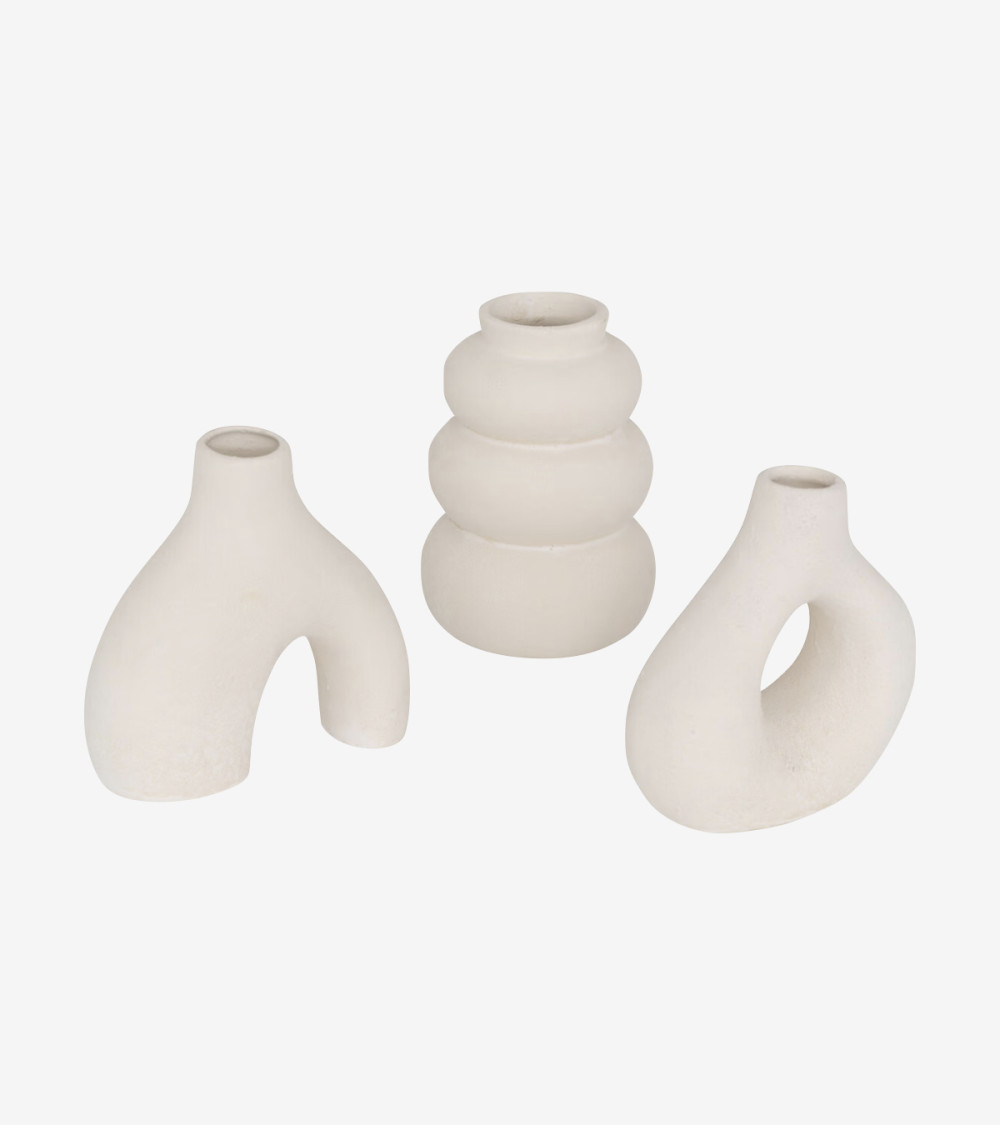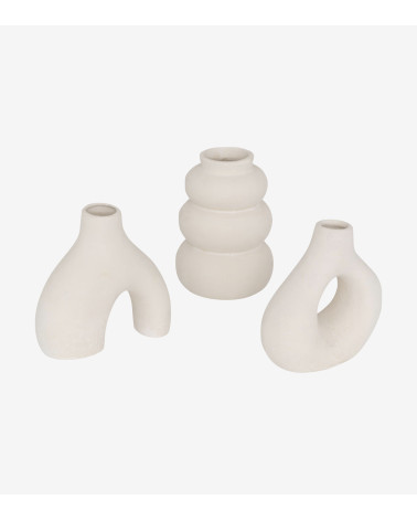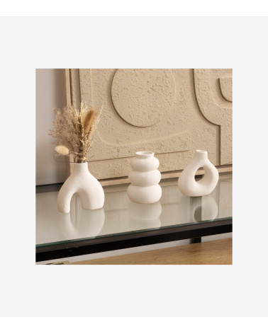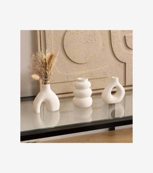 Craquez pour le lot de 3 soliflores à la fois naturels et tendance ! Composé de trois petits vases aux formes graphiques, cet ensemble en céramique blanche vous permettra d'habiller une console avec une touche élégante. En forme de pont, de donut ou à vagues, ces soliflores sont vos alliés pour mettre en valeur des fleurs fraîches ou séchées.