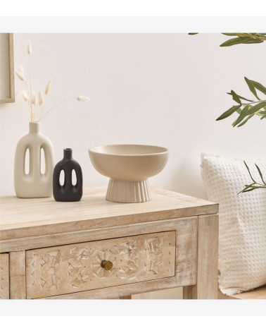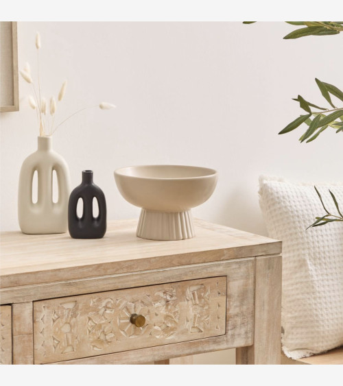 La coupelle est conçue en céramique beige et elle est montée sur un pied conique à cannelures. Chic et épurée, elle est de diamètre idéal pour servir de vide-poches dans une entrée. Vous pourrez également la placer au centre d'une table à manger en bois ou d'un îlot de cuisine et y déposer quelques fruits colorés.